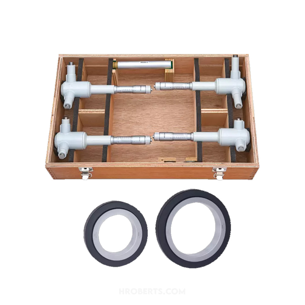 A Mitutoyo internal micrometer set consisting of individual gauges, the appropriate setting rings and an extension tube for depth measurement applications. Contact surfaces made of hardened steel. A ratchet guarantees repeatable measurement.
