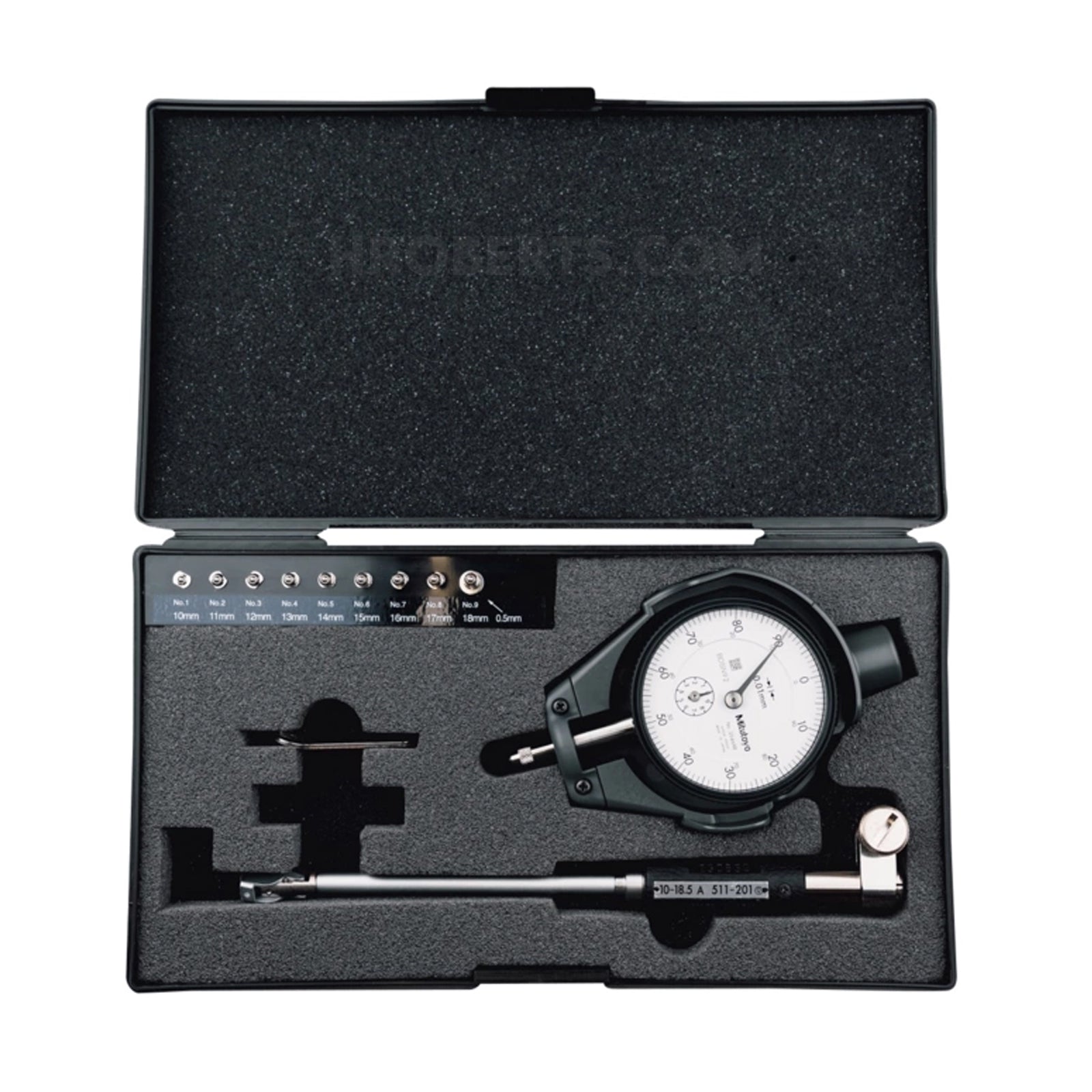 The interchangeable anvils used on this gauge are made of high-grade tool steel. Interchangeable washers 0.5 mm thick are supplied as standard accessories to enable setting the 10 - 18.5mm / 0.4 - 0.74" models in small steps. The dial indicator is fully protected by a rugged cover. An optional inside-length standard, such as a setting ring or Inside Micro Checker is required for accurately setting the gauge before measurement.