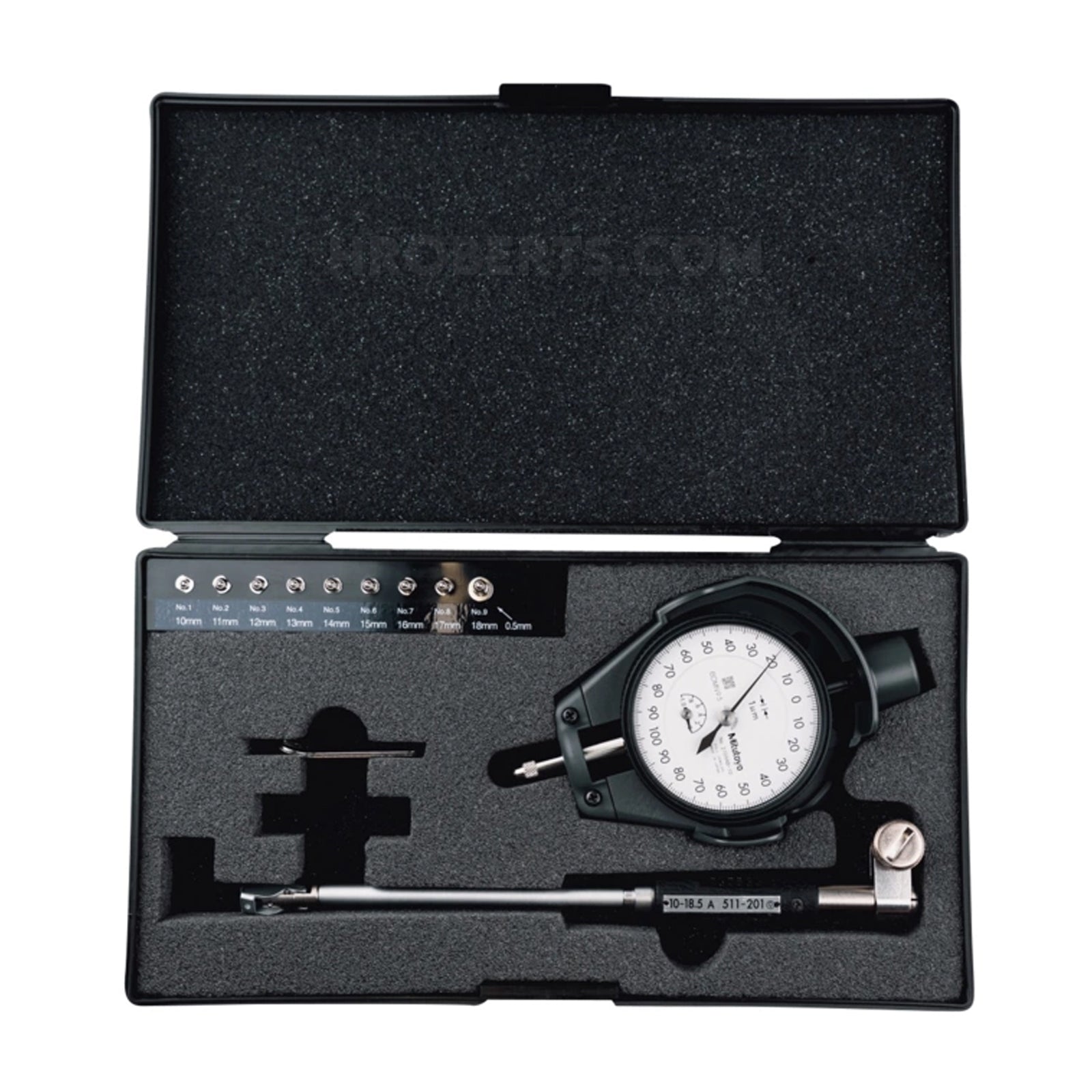 The interchangeable anvils used on this gauge are made of high-grade tool steel. Interchangeable washers 0.5 mm thick are supplied as standard accessories to enable setting the 10 - 18.5mm / 0.4 - 0.74" models in small steps. The dial indicator is fully protected by a rugged cover. An optional inside-length standard, such as a setting ring or Inside Micro Checker is required for accurately setting the gauge before measurement.