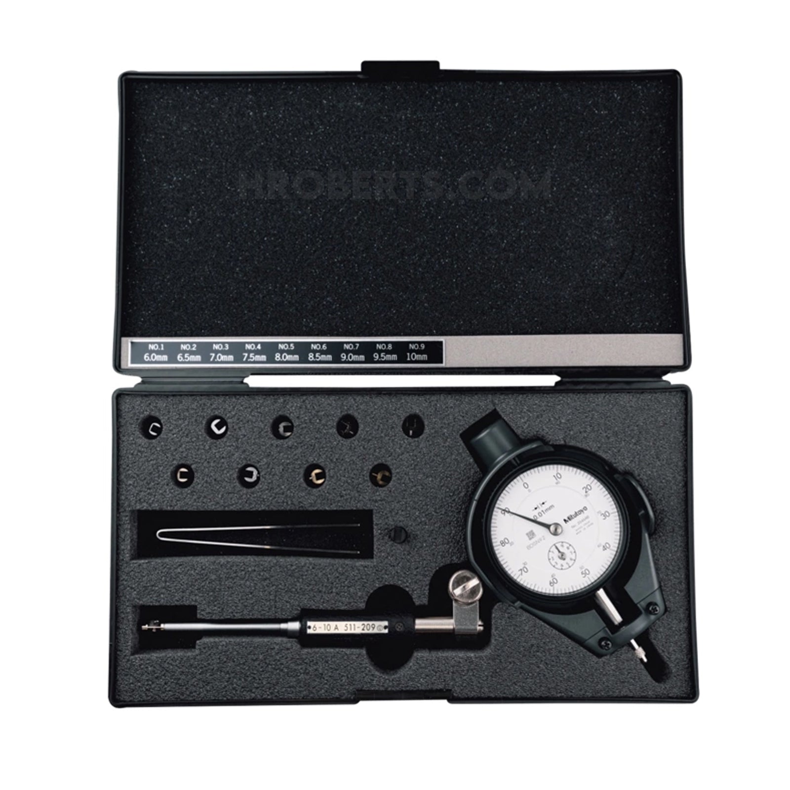 The interchangeable anvils used on this gauge are made of high-grade tool steel. Interchangeable washers 0.5 mm thick are supplied as standard accessories to enable setting the 10 - 18.5mm / 0.4 - 0.74" models in small steps. The dial indicator is fully protected by a rugged cover. An optional inside-length standard, such as a setting ring or Inside Micro Checker is required for accurately setting the gauge before measurement.