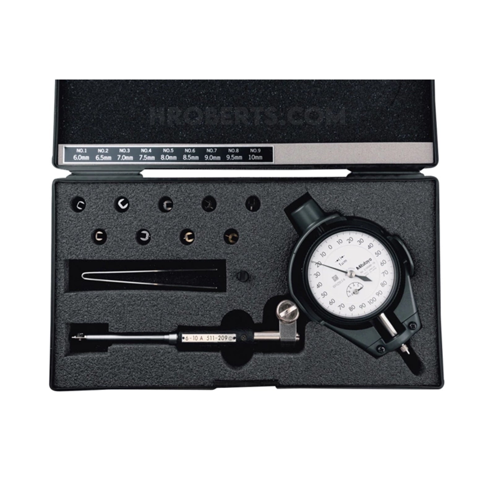 The interchangeable anvils used on this gauge are made of high-grade tool steel. Interchangeable washers 0.5 mm thick are supplied as standard accessories to enable setting the 10 - 18.5mm / 0.4 - 0.74" models in small steps. The dial indicator is fully protected by a rugged cover. An optional inside-length standard, such as a setting ring or Inside Micro Checker is required for accurately setting the gauge before measurement.