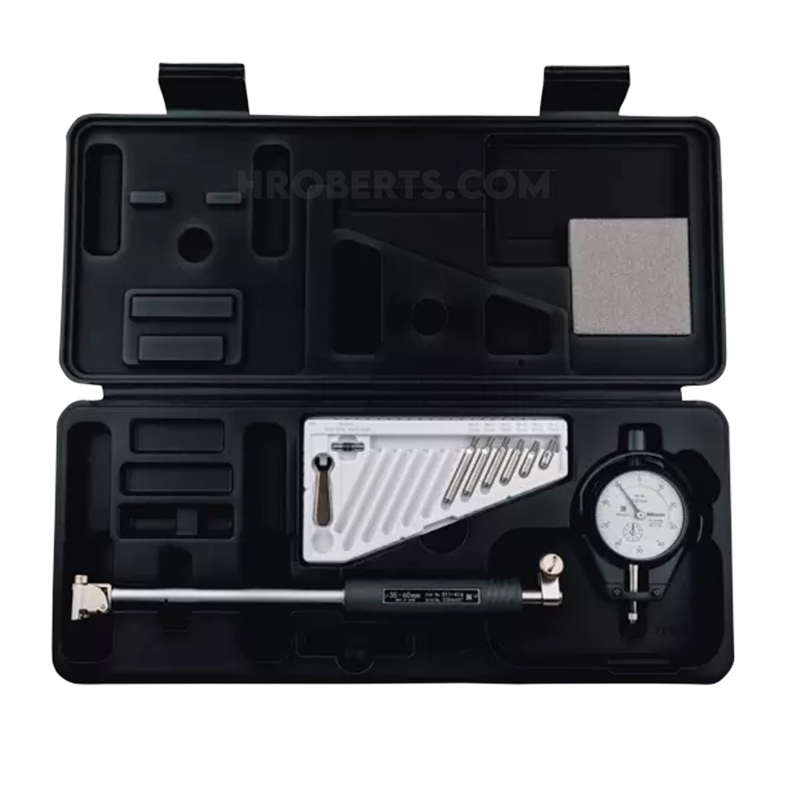 Flat-bottomed head design enables measurement right down to the bottom of blind holes or bores. Carbide-tipped contact point for durability. Extension rods (optional) can be attached for measuring deep holes. Wide measuring range with sub-anvils. An optional inside-length standard, such as a setting ring or Inside Micro Checker is required for accurately setting the gauge before measurement.