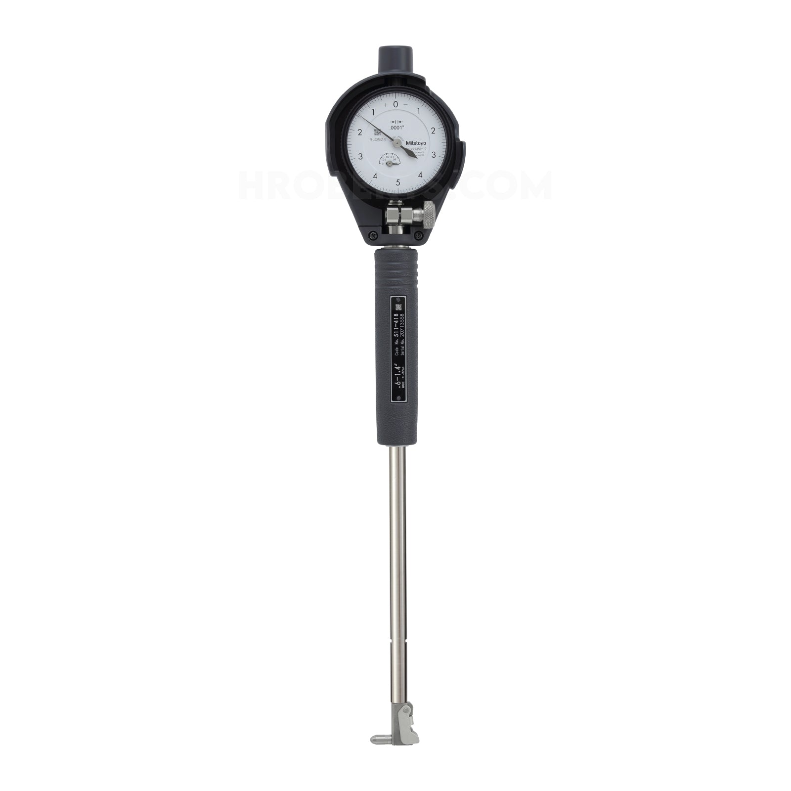 Flat-bottomed head design enables measurement right down to the bottom of blind holes or bores. Carbide-tipped contact point for durability. Extension rods (optional) can be attached for measuring deep holes. Wide measuring range with sub-anvils. An optional inside-length standard, such as a setting ring or Inside Micro Checker is required for accurately setting the gauge before measurement.