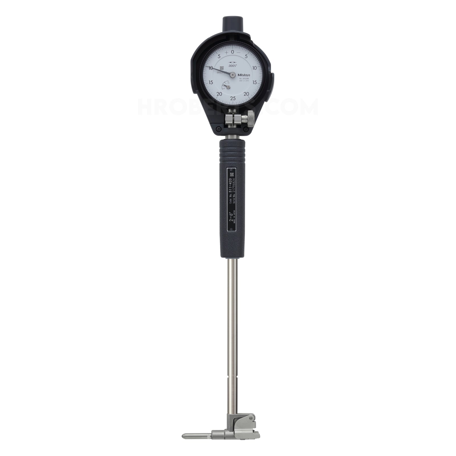 Flat-bottomed head design enables measurement right down to the bottom of blind holes or bores. Carbide-tipped contact point for durability. Extension rods (optional) can be attached for measuring deep holes. Wide measuring range with sub-anvils. An optional inside-length standard, such as a setting ring or Inside Micro Checker is required for accurately setting the gauge before measurement.