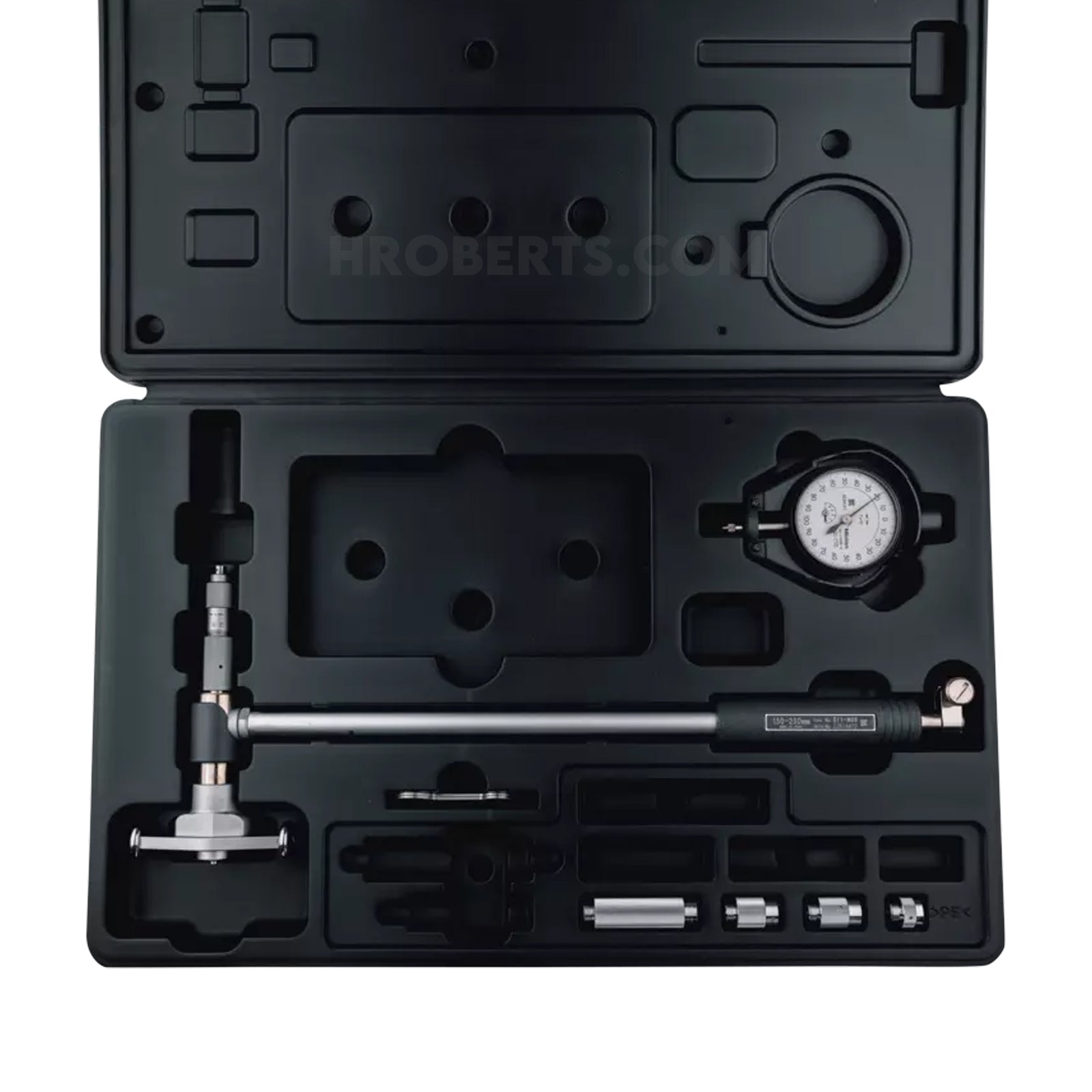 Micrometer head is attached to the anvil for convenient and accurate dimensional setting. Now offers a longer plunger stroke while maintaining original accuracy. Carbide is used for the contact point ensuring high durability and wear resistance. High-accuracy measurement is aided by a large grip with a sponge-like structure that reduces heat transfer from the operator’s hand by 50%. Wide measuring range with sub-anvils. Optional extension rods can be attached for measuring deep holes. An optional inside-length standard, such as a setting ring or Inside Micro Checker is required for accurately setting the gauge before measurement.