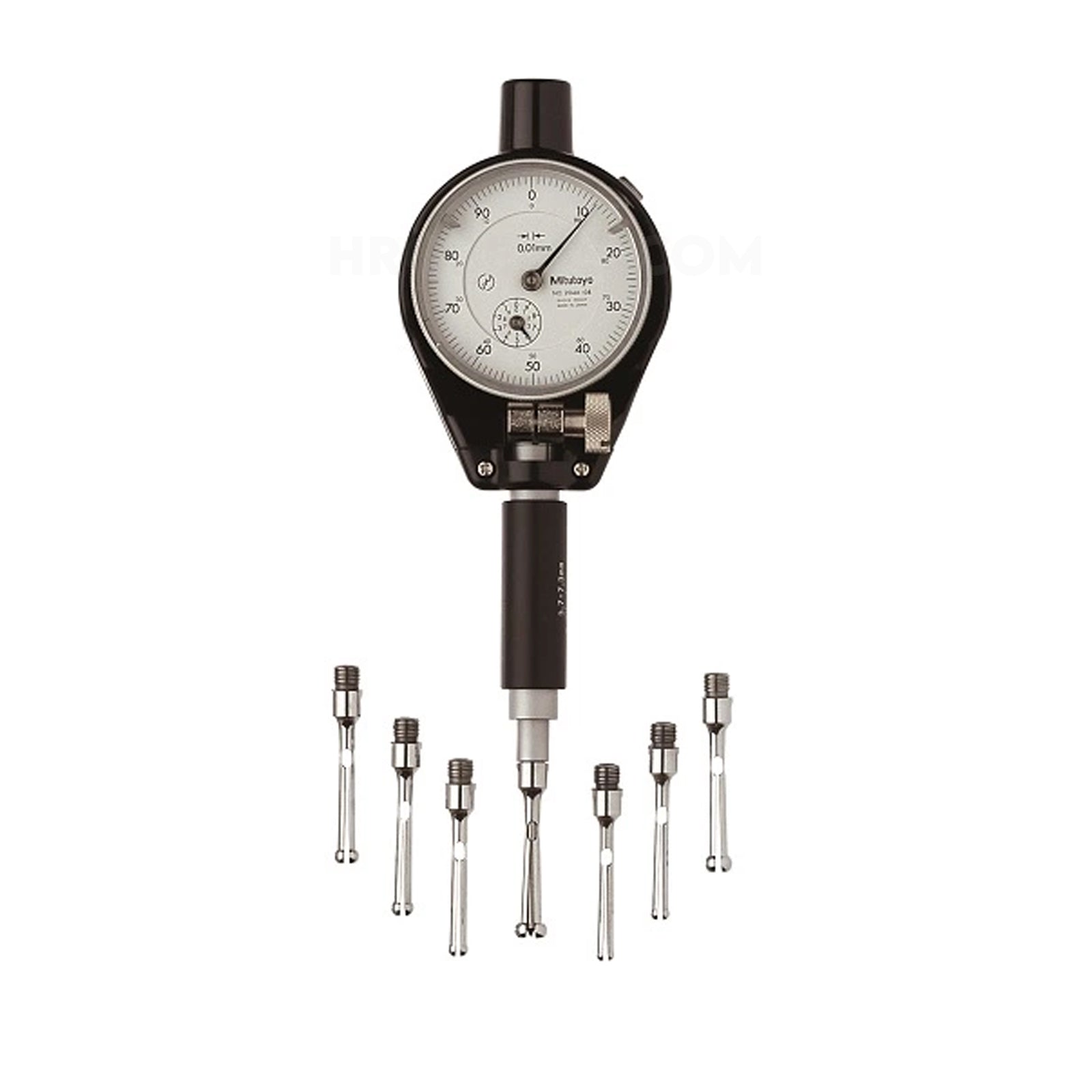 This gauge is designed to measure the diameters of very small holes. The radial displacement of the split-ball anvil is converted to axial displacement of the measuring rod, which is shown on the dial indicator. An optional stand (215-120-10) is available for efficient measurement of multiple small holes.