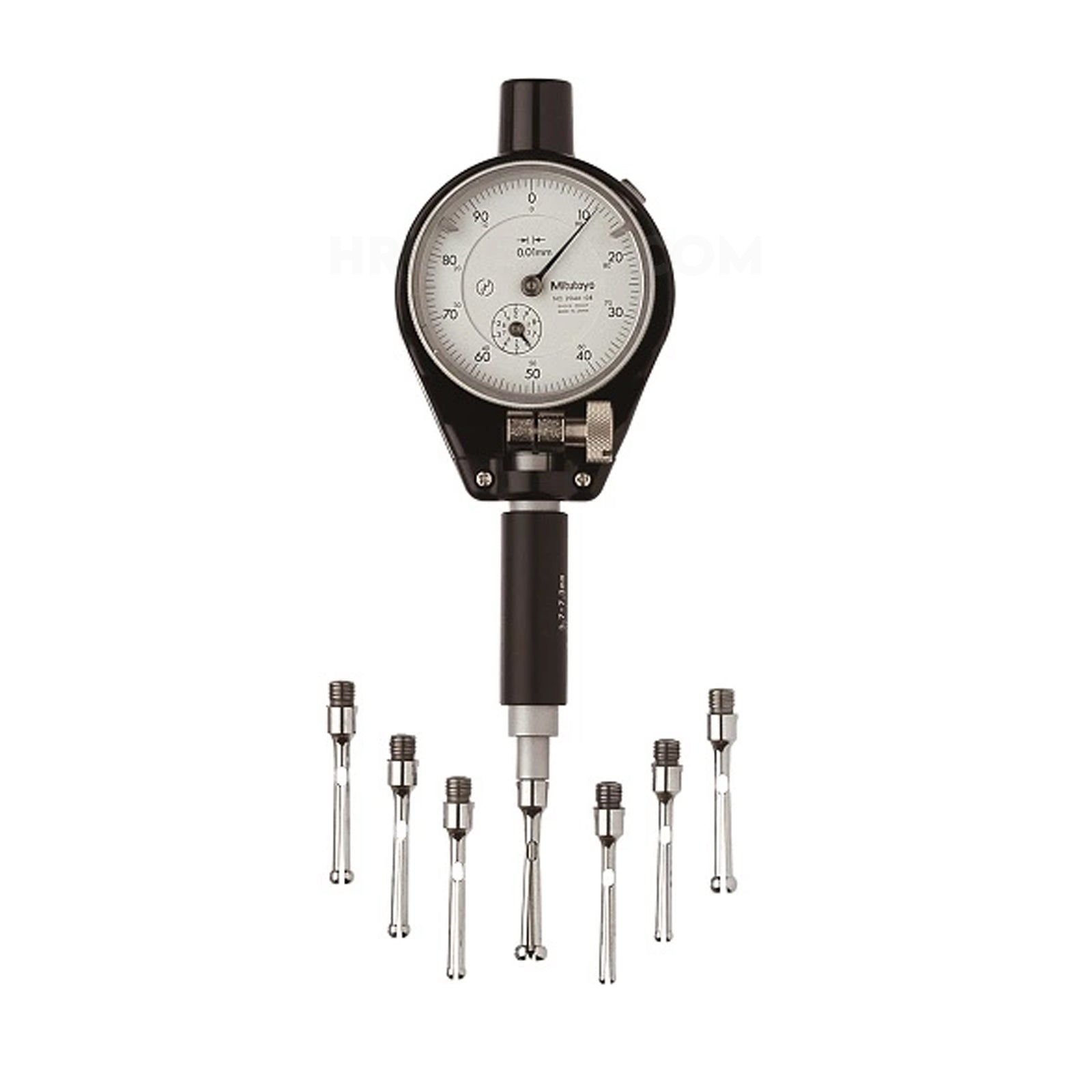 This gauge is designed to measure the diameters of very small holes. The radial displacement of the split-ball anvil is converted to axial displacement of the measuring rod, which is shown on the dial indicator. An optional stand (215-120-10) is available for efficient measurement of multiple small holes.