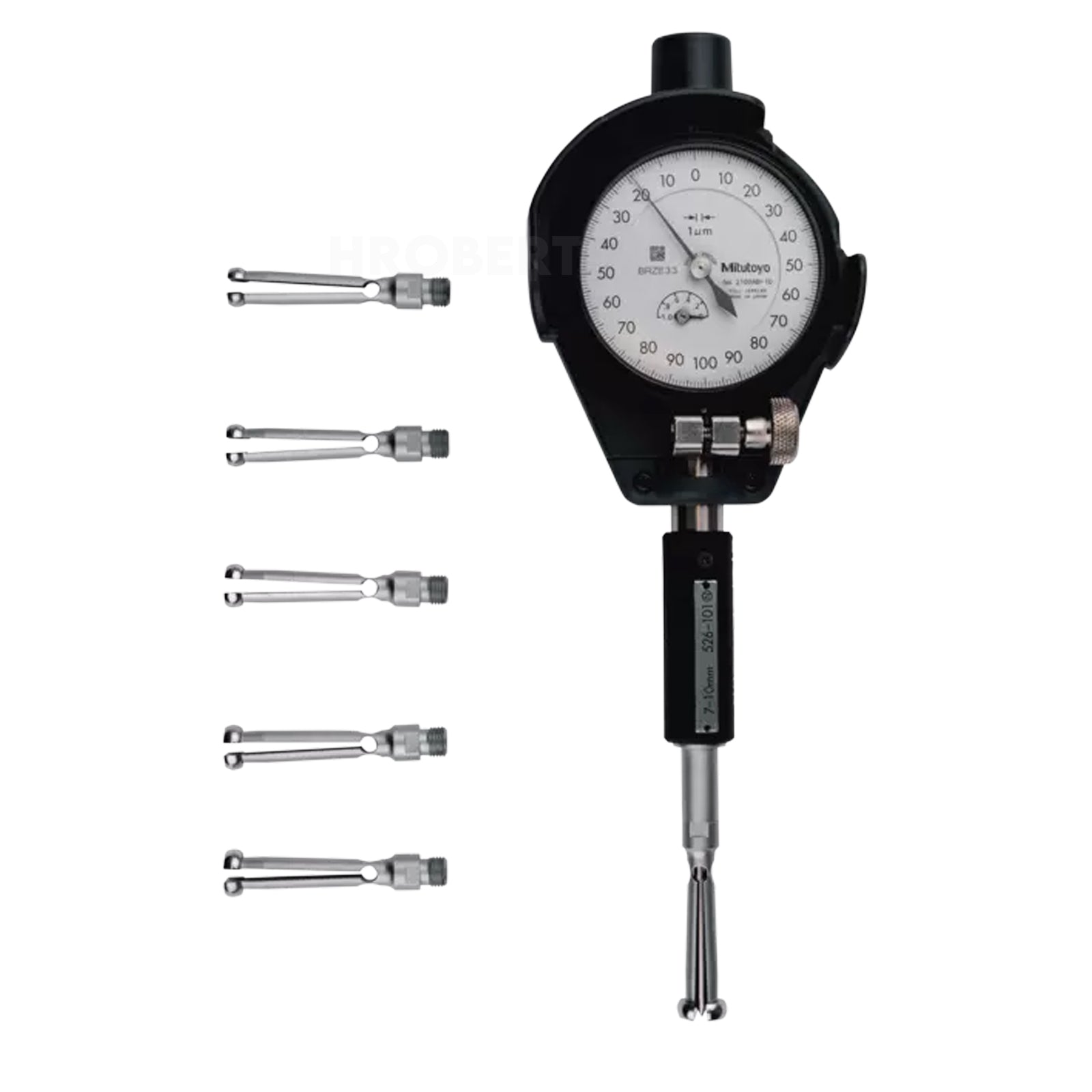 This gauge is designed to measure the diameters of very small holes. The radial displacement of the split-ball anvil is converted to axial displacement of the measuring rod, which is shown on the dial indicator. An optional stand (215-120-10) is available for efficient measurement of multiple small holes.
