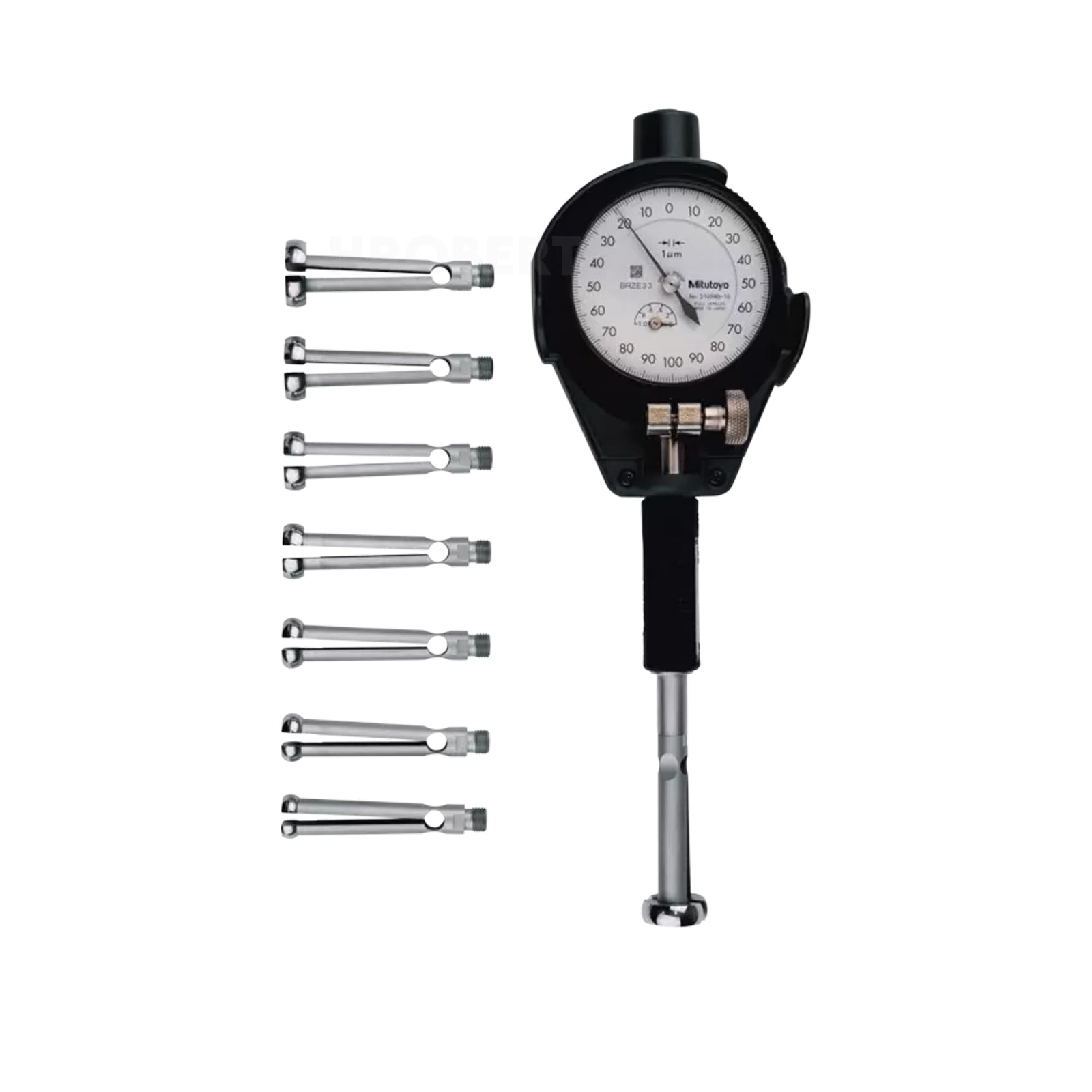This gauge is designed to measure the diameters of very small holes. The radial displacement of the split-ball anvil is converted to axial displacement of the measuring rod, which is shown on the dial indicator. An optional stand (215-120-10) is available for efficient measurement of multiple small holes.