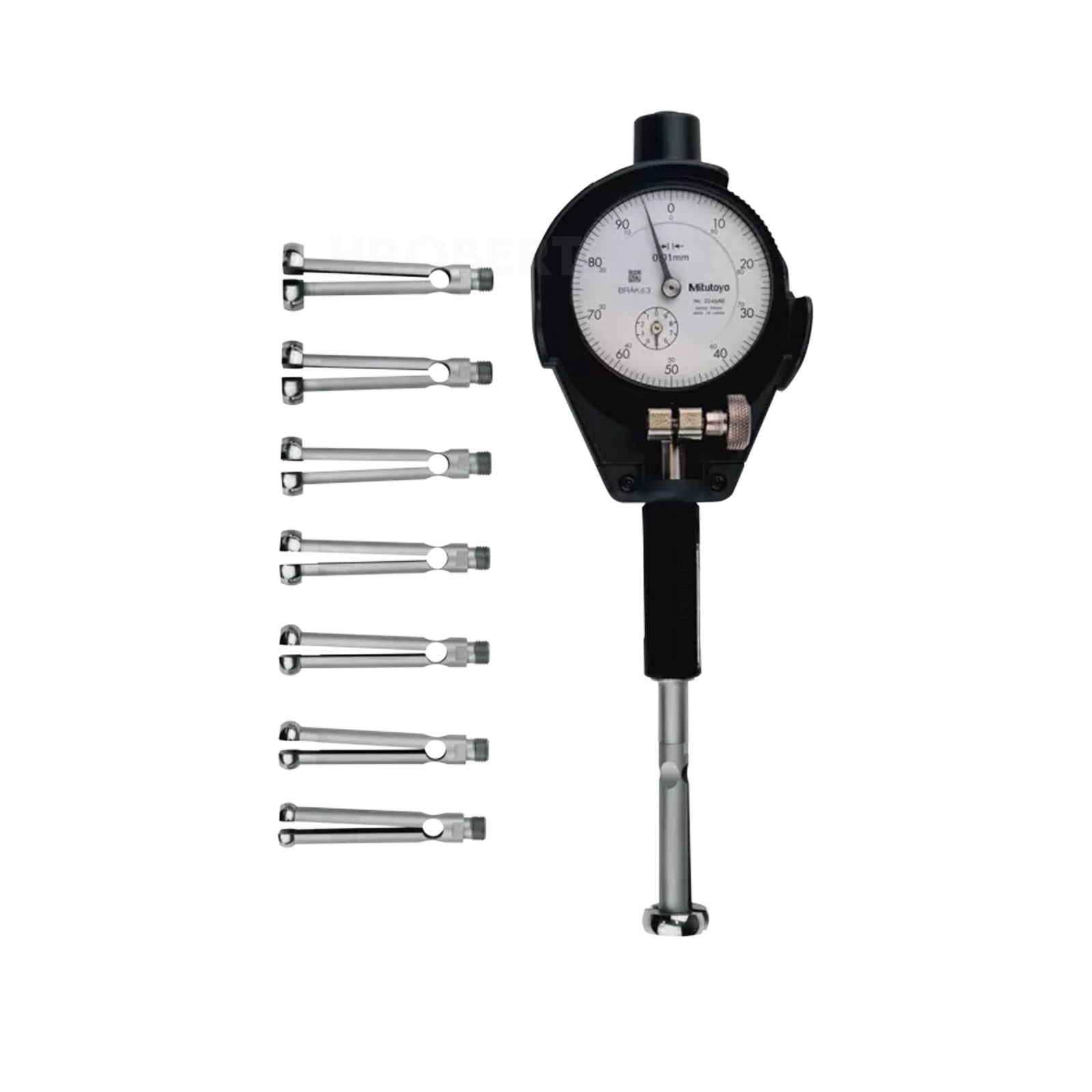 This gauge is designed to measure the diameters of very small holes. The radial displacement of the split-ball anvil is converted to axial displacement of the measuring rod, which is shown on the dial indicator. An optional stand (215-120-10) is available for efficient measurement of multiple small holes.