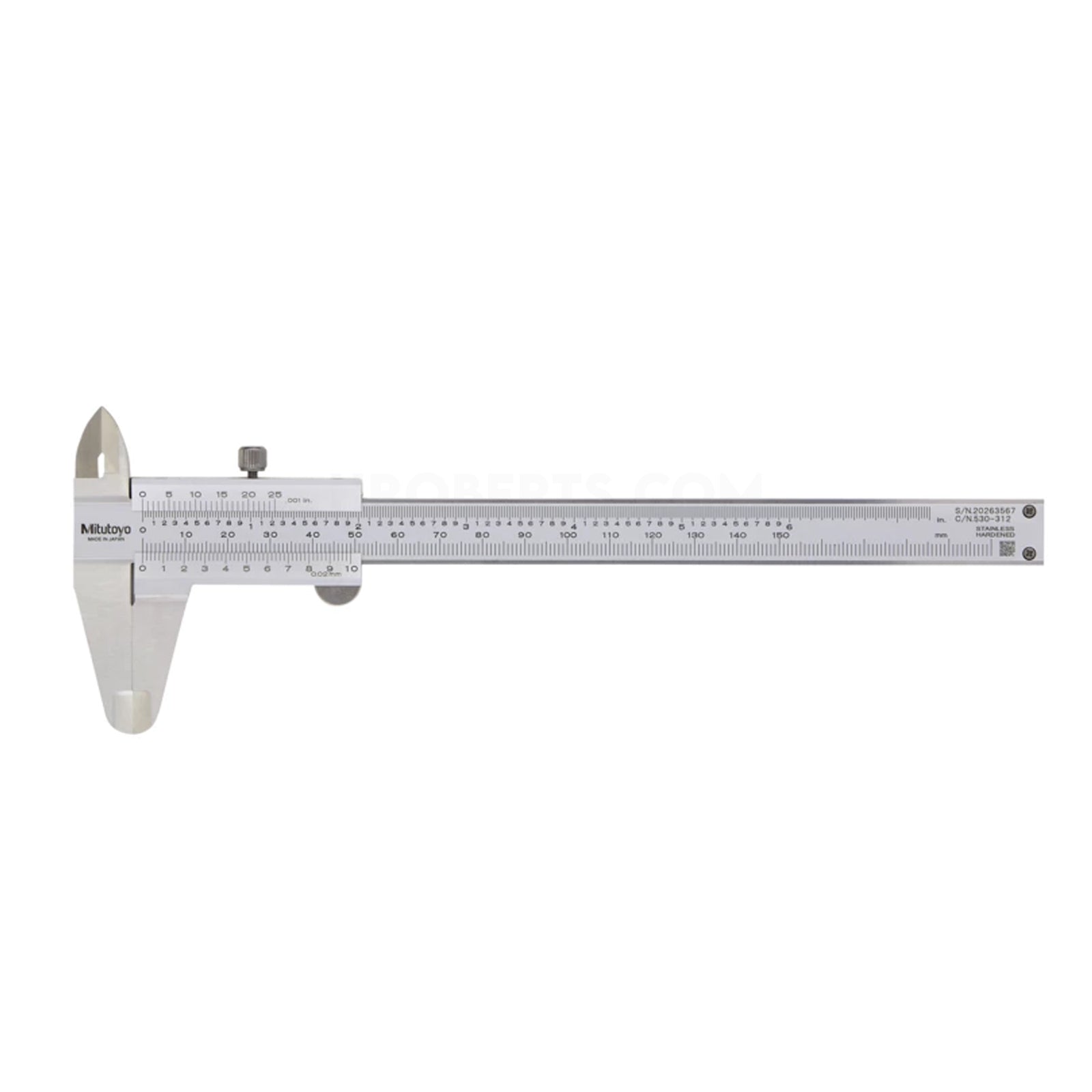 Stepped graduation face prevents dust ingress between the main scale and slider. The small vernier face angle (14°) provides easy reading. Can measure outside and inside dimensions, depth, and steps.